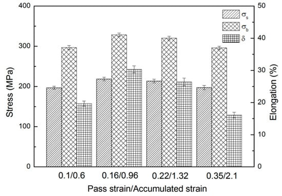 The mechanical properties of the alloys HSRMFed to 6 pass with different pass strains are shown in Figure 8, and the tensile data is listed in Table 1, containing yield strength (YS) σs, ultimate tensile strength (UTS) σb and elongation δ. As can be seen in Figure 8 and Table 1, both of the strength and elongation increased with a pass strain as Δε < 0.16 while decreased with the pass strain increasing as Δε > 0.16. An excellent combination of mechanical properties with the ultimate tensile strength (UTS) of 328 MPa and elongation of 30% was achieved in the alloy HSRMFed to 6 pass with a pass strain of Δε = 0.16.