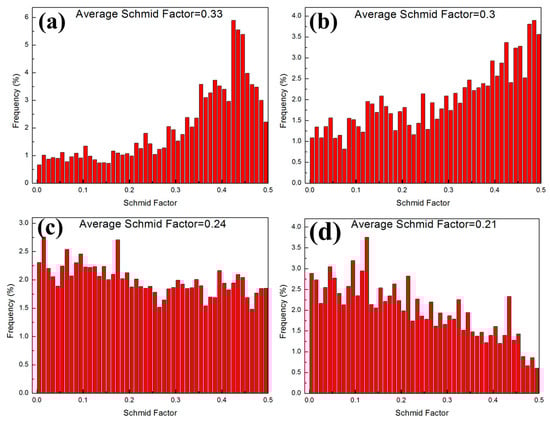 Schmid factor distribution of {0001} <112(-)0> basal slip along rolling direction (RD) in alloys HSRMFed with different pass strains (a) 0.1, (b) 0.16, (c) 0.22 and (d) 0.35.