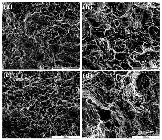 Figure 10 shows the tensile fracture images for alloys HSRMFed to 6 pass with different pass strains. As shown in Figure 10a,d, a typical quasi-cleavage was observed in the alloys HSRMFed with a pass strain of Δε = 0.1 and 0.35. A number of dimples were found at the fracture surface, while tearing ridges and cleavage steps were found with low quantity. The fracture of the alloy HSRMFed with medium pass strains (Δε = 0.16–0.22) are characteristic of excellent ductility, and no obvious tearing ridge could be found on the fracture surface, and the entire sample was covered by large amount of dimples, as shown in Figure 10b,c. The dimples in the alloy HSRMFed with a pass strain of Δε = 0.16 were deeper and larger than that of the alloy HSRMFed with a pass strain of Δε = 0.22, indicating better ductility was achieved in the alloy HSRMFed with a pass strain of Δε = 0.16. Take the mechanical properties given in Figure 8 and Table 1 into consideration, the fracture images were in good agreement with the ductility.
