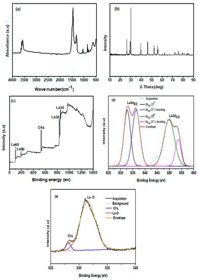 Spectroscopic characterization: (a) FT-IR spectra, (b) XRD patterns, and (c) XPS patterns of La2O3 nanorods, and (d) high-resolution XPS of La 3d and (e) O 1s of prepared La2O3.