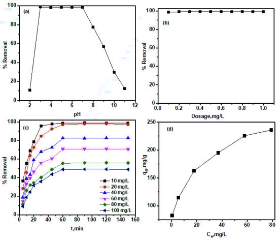 As(V) adsorption onto La2O3 (10–100 mg/L, 0.1 g/L, pH 6.0) and the effects of (a) pH, (b) dosage (20 mg/L, pH 6.0) (c) kinetics, and (d) isotherms at 25 °C for 60 min equilibrium.