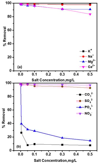Co-existing ions: (a) cations’ and (b) anions’ influences on La2O3 adsorptive removal of As(V) (10 mg/L) with 0.1 g/L La2O3 dosage, at pH 6, and 25 °C for 60 min equilibrium.