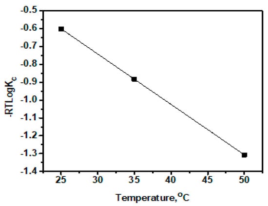 The thermodynamic parameters, enthalpy (ΔH0), entropy (ΔS0), and Gibbs free energy (ΔG0) of As(V) adsorption using La2O3 can be calculated from RT logKc vs. T (Figure 5). The values of the free energy change (ΔG0) are calculated using