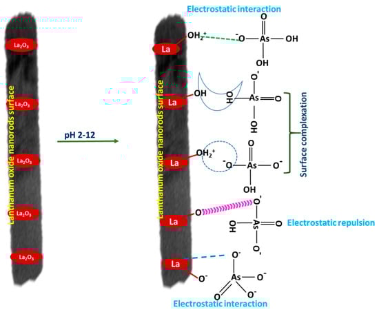 Based on batch adsorption studies, including pH, kinetics, and equilibrium isotherms results, the adsorptive removal of As(V) with La2O3 involves electrostatic interaction and surface complexation. From the pH experiment, high adsorption was obtained between pH 3.0–7.0, suggesting an electrostatic attraction between anionic arsenic species and the positive surface charge of the nanorods (Figure 6). However, arsenic removal decreased when pH was increased to 7.0–12.0, implying an electrostatic repulsion between the negative surface charge of the adsorbent and anionic species of As(V). Regardless, there is still significant adsorptive removal, revealing that the adsorption process involved chemical surface complexation predominantly at higher pH values (3.0–7.0). Thus, both electrostatic interaction and chemical surface complexation led to the adsorption process of As(V) at pH 3.0–7.0, which is further confirmed by FTIR results (Figure 7). Figure 7 clearly showed –OH (~3576 cm−1) and La–O (~498 cm−1) peaks altered by the adsorption of As(V), suggesting an adsorption process through surface complexation along with electrostatic interactions. The overall results of the adsorption process suggest that the electrostatic attraction of arsenic species through the protonated surface of La2O3 and surface complexation are predominant in acidic conditions, while electrostatic repulsion and surface complexation of arsenic species with the La2O3 surface are predominant in basic conditions. These representations are clearly shown in Figure 6 for better understanding.