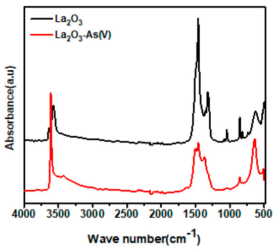 FT-IR spectra of La2O3 nanorods before and after As(V) adsorption.
