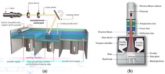 Main components of (a) Selective Laser Melting (SLM) machine, (b) Electron Beam Melting (EBM) machine. Adapted from [20], under CC BY 4.0. Original sources: (a) EMPA, (b) ARCAM.