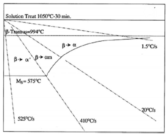 Titanium alloys have been receiving special attention from the aerospace industry, thanks to the low density and the high melting point of this material (around 1650 °C) [21]. In other words, several companies turn to titanium when they need a light component that is capable of safely supporting high loads and/or when working temperatures are high [22]. In addition, it has also a high corrosion resistance [23,24,25], and it is often used in medical implants due to its excellent biocompatibility when in contact with tissues or bones of the human body [26]. Note that this material is quite difficult and expensive to machine, so its use and diffusion in AM is of great interest [27,28]. In fact, the titanium alloy most studied by the scientific community and used to manufacture final components is Ti–6Al–4V (UNS R56400) [29]. The crystalline structure of this alloy is composed of a compact hexagonal structure (phase α) and body-centered cubic (phase β). The existence of aluminum and vanadium causes the α and β phases to stabilize, respectively, maintaining the dual phase at room temperature [22]. In general, the microstructure, when depositing material, presents a martensitic phase (α′) due to the rapid cooling of the manufacturing process. In addition to the quick cooling, the α′ phase will only form if the build temperature is kept below the martensite start temperature (Ms) [30]. The aforementioned temperature varies from 575 °C up to 800 °C [31,32,33] as the impure elements along with the initial microstructure and composition homogeneity affect the Ms temperature [34]. In Figure 2, it is possible to analyze how the phase transformation is affected by the distinct cooling rates, i.e., in the region of 525–410 °C/s the α′ phase will be formed; however, if the cooling rate is kept under 20 °C/s, it will lead to the formation of the phase α.