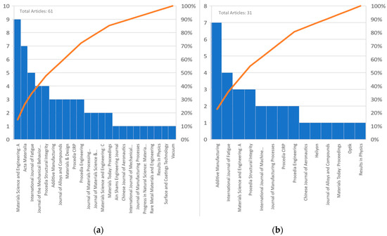 Pareto’s charts of the research, (a) “Heat Treatments + Electron Beam Melting + Ti–6Al–4V”, and (b) “Residual Stresses + Electron Beam Melting + Ti–6Al–4V”, on ScienceDirect.