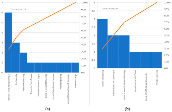 Pareto’s charts of the research, (a) “Heat Treatments + Selective Laser Melting + Ti–6Al–4V”, and (b) “Residual Stresses + Selective Laser Melting + Ti–6Al–4V”, on ScienceDirect.