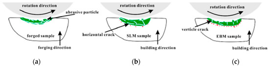 In another report, Zhang et al. [59] studied and compared the wear resistance of as-built SLM, as-built EBM, and forged Ti–6Al–4V samples. Then, the authors performed friction and wear tests to the three types of samples and concluded that when compared to the forged specimens, the additively manufactured ones exhibited a better wear resistance owing to their weaker delamination and higher hardness. Moreover, the SLMed samples showed a higher wear rate than the EBMed ones due to the higher number of horizontal cracks of the former, as shown in Figure 9.