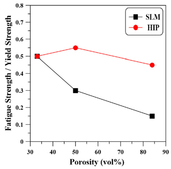 Several authors [68,69,70,71,72,73] studied the fatigue properties of the titanium alloy manufactured via metal powder bed fusion. Chastand et al. [68] investigated the influence of different manufacturing processes, build orientation, surface roughness, and HIP treatment on the fatigue life of titanium samples. To do that, the researchers manufactured several specimens in SLM and EBM machines with different build orientations, namely XY and Z. Then, all the SLMed specimens underwent a stress relief treatment at 640 °C for 4 h, while others undertook a stress relief + HIP treatment at 920 °C under 1020 bar for 2 h. After that, the authors conducted the same HIP treatment to 12 EBMed specimens and then machined and polished the surface of several SLMed and EBMed samples. After conducting the fatigue tests, Chastand et al. [68] reported that the manufacturing processes (SLM and EBM) effect is negligible on the fatigue properties, as a similar type of defects was found in both cases. Moreover, machining and polishing improved the fatigue properties of the titanium alloy because it lowered the surface roughness and removed superficial defects. Furthermore, the HIP treatment led to the size decrease of the internal defects, hence improving the fatigue properties. To conclude, the authors also reported that the effect of the build direction highly depends on the presence of unmelted zones. In a similar study, Wu et al. [71] investigated the porosity and HIP treatment effect on the fatigue endurance ratio of SLMed titanium samples. For that, the researchers purposely manufactured cellular structures with three different porosities (33 vol%, 50 vol%, and 84 vol%) and then subjected some of them to an HIP treatment at 1000 °C and a pressure of 150 MPa for 1 h. After studying the microstructure, the authors reported that the heat treatment promoted the transformation of the martensitic microstructure into a lamellar α + β phase. Then, the researchers conducted fatigue tests and concluded that the porosity increase in the as-built samples led to a decrease in the fatigue endurance ratio, as shown in Figure 10, due to the low ductility of α′. However, in the HIPed samples, as the porosity increased from 33 vol% to 50 vol%, the fatigue endurance ratio at 10⁶ cycles increased from 0.5 up to nearly 0.55, Figure 10. Moreover, when compared to the as-built specimens, the HIPed ones exhibited far better fatigue endurance ratios as the porosity increased. Similarly, Vispoli et al. [72] investigated the surface roughness effect on the fatigue behaviour of Ti–6Al–4V samples produced via SLM. The authors reported that the fatigue resistance of the as-built specimens, when compared to the machined ones, evidenced a drastic reduction due to the elevated roughness.