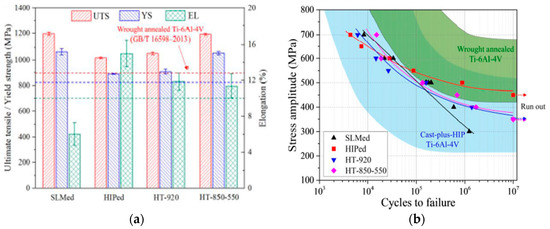 Likewise, Yu et al. [73] studied the influence of distinct heat treatments and surface finishing processes on the fatigue performance of titanium samples produced via SLM. The authors employed four different finishing processes, namely turning, 400 mesh sandpaper grinding, 400 mesh sandpaper grinding + sandblasting, and polishing. Furthermore, the researchers also conducted three distinct heat treatments, which can be seen in Table 2. After the fatigue tests, the authors concluded that all the surface-finishing processes reduced the as-built arithmetic mean roughness (Ra = 12.16 µm), hence significantly improving the fatigue performance of the samples. Furthermore, as is possible to analyze in Figure 11a, when compared to the as-built specimens, the HIPed and HT-920 ones showed lower YS and UTS; however, the ductility was greatly improved. On the contrary, the HT-850-550 specimens showed no obvious reduction in the YS and UTS when compared to the as-built ones, and the ductility of the former specimens was also better than the latter. Finally, the heat treatments promoted the increase of the fatigue limit, as the HT-920 and HT-850-550 samples exhibited a stress amplitude of approximtaely 400 MPa for 10⁶ cycles, and the HIPed samples showed a stress amplitude of approximtaely 500 MPa for the same number of cycles, as shown in Figure 11b.