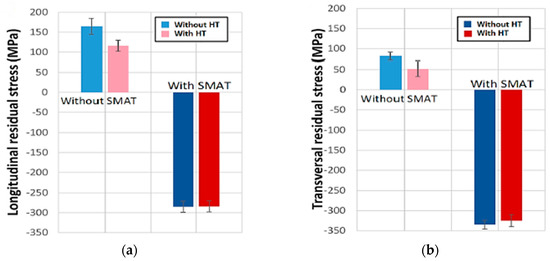 Post-treatment effects on (a) longitudinal residual stresses and (b) transversal residual stresses. Adapted from [115], under CC BY 4.0.