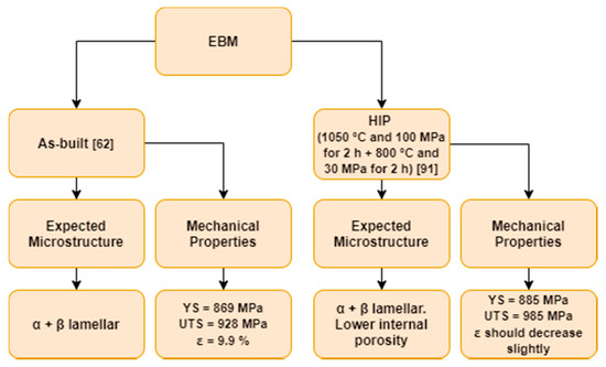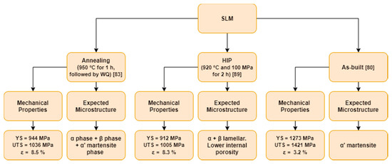 Finally, in Figure 16 and Figure 17, it is possible to analyze two similar diagrams that explain and summarize the expected mechanical properties and microstructures of as-built and heat-treated EBMed and SLMed Ti–6Al–4V components, respectively.