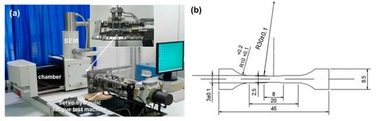 Figure 1. Fatigue test setup and specimen: (a) In situ SEM fatigue testing facility; (b) Fatigue test specimen geometry (dimensions in mm).