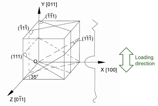 The material used in this study was a nickel-based single crystal superalloy, which was developed for fabricating high-performance gas-turbine blades [17]. The nominal composition of this NBSC alloy is (in wt.%): 0.067 C, 3.9 W, 12.0 Cr, 9.0 Co, 3.6 Al, 5.0 Ta and the remainder is Ni. The slab specimen had a dog-bone shape with a 2.5 mm by 0.4 mm gauge cross section, as shown in Figure 1. In the present experimental study, the specimen/loading axis is along [011], with the transverse orientation (crack growth direction) along [100], as shown in Figure 2. It is known that multiple octahedral slip systems, i.e., {111} <110>, can be activated in the NBSC alloy. Figure 4 shows the duplex octahedral slip planes and the corresponding slip directions, respectively.