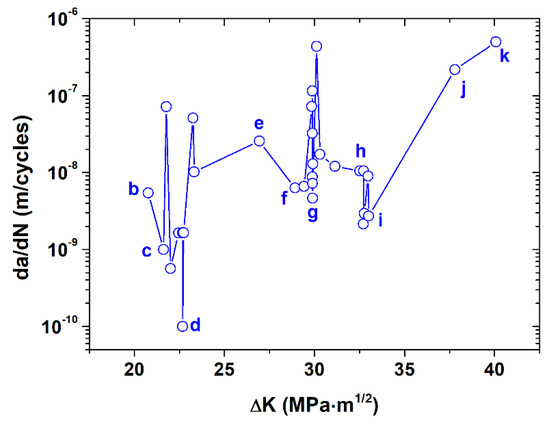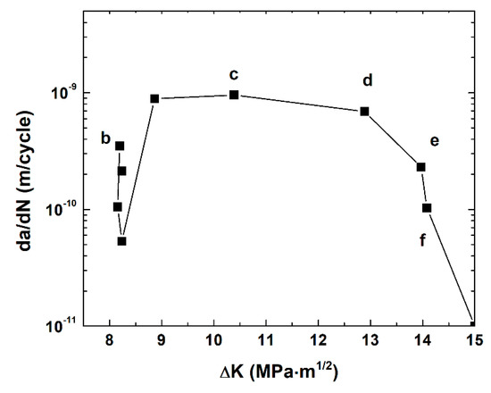 As adopted in many studies, the crack growth rate (da/dN) was plotted against the stress intensity range (ΔK), as first proposed by Paris and Erdogan [21]. The fatigue crack growth rate curve is shown in Figure 6. The initial propagation of fatigue crack was fast at “b” and showed deceleration afterwards. The fatigue crack propagated at a slow rate, until an evident crystallographic crack tip was formed, shown in Figure 5c. The crack propagated obviously along the crystallographic plane in the next thousand cycles, shown in Figure 5c–e, at a relatively stable propagation rate, as shown in Figure 5d–e. Afterwards, as shown in Figure 5f, a secondary crack nucleating from the carbide at recrystallized GB was formed, following the same direction as the prior crack. In the remaining fatigue life cycles, these two fatigue cracks did not merge with each other and the fatigue cracks were almost non-propagating, or the propagation was negligible, as shown in Figure 5f.