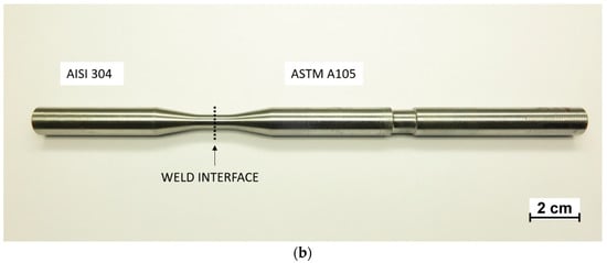The possibility of joining distinct materials is a very attractive opportunity in the assembly and design of high-performance components for high-duty technological applications, such as in the automotive or in the aeronautic field [1]. Many of the structural elements in pressure vessels, spacecraft, and transport applications, as well as in offshore and nuclear structures are made of welded joints [2,3,4]. The coupling of different materials is very intriguing as it is possible to take advantage of the best properties of each material and build components with good structural and lightweight characteristics, but, on the other hand, it represents a challenge because new phenomena, arising from their interaction, must be taken under consideration [5]. Dissimilar joints can be realized using different techniques, such as threading or the use of adhesives [6], but the production rate and life expectancy of these joints is not so high. High-performance joints can be obtained exploiting solid-state welding methods [7], such as rotary friction welding (RFW) and linear friction welding (LFW) [8,9]. Friction welding (FW) techniques allow coupling dissimilar materials, such as metals, ceramics, polymers, and composites [10,11,12] that cannot be joined by conventional fusion welding techniques, operating at temperatures lower than the melting point of the materials being welded together. Despite all these positive aspects, it is necessary to point out that FW techniques could affect the material composition and structure and could also cause the precipitation of brittle phases [13] as well as the formation of cracks [13,14]. Friction welding is exploited using the relative motion of the two pieces pressed against each other, thus producing the needed heat by the conversion of mechanical energy into thermal energy, without any external heat input [6]. Rotation speed, applied load, and welding time are the main process parameters to be considered [5,6,15]. These can be adjusted to reach the plastic temperature range close to the interface where atomic diffusion happens and metallurgical bonds form. Austenitic stainless steel-steel joints are very common and possess a good combination of mechanical properties, formability, weldability, and resistance to corrosion [16,17,18]. Many studies are present in the literature about the microstructural characteristics, phase formation at the interface, and tensile properties of these type of joints, but only few data are present about extensive fatigue studies and fatigue corrosion investigations.