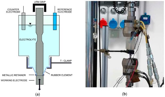 In order to exploit corrosion fatigue tests and apply a given potential to the specimens, it was necessary to develop an easy-to-build electrochemical cell, paying attention not to interfere with the fatigue tests and to avoid electrical contact between the samples and the testing apparatus. The design of the cell accounted for various factors, such as the ease to be built, to be operated, and to be replaced as well. The possibility of easily building and replacing the cell allows performing customizable tests. Figure 2 shows a sketch of the electrochemical cell and a photograph of the experimental setup.