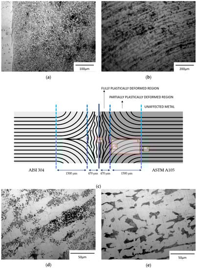 Optical images of the welded sample microstructures. (a) Interface region (AISI 304 on the left side and ASTM A105 on the right side of the interface); (b) intermediate region; (c) schematic representation of the sample; (d) intermediate region at high magnification; (e) base metal.