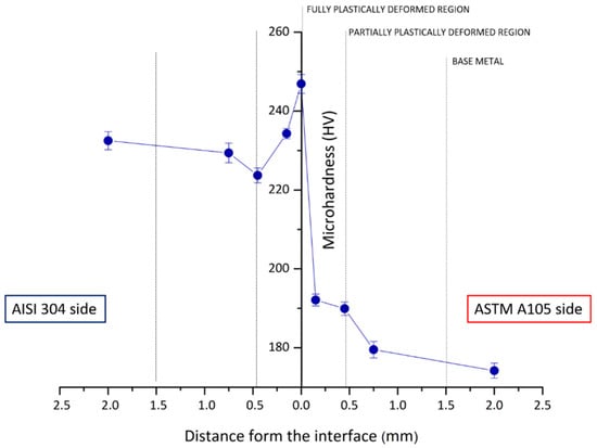 Vickers hardness distribution through the weld interface.