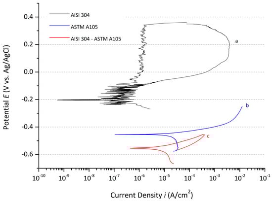 Potentiodynamic polarization curves in a 3.5 wt% NaCl solution of: (a) AISI 304; (b) ASTM A105; (c) welded AISI304—ASTM A105.