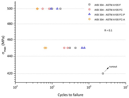 The results obtained by the fatigue testing of welded AISI304—ASTM A105 samples under different conditions: Fatigue in air (F), fatigue corrosion (FC), protected fatigue corrosion (FC-P), and accelerated fatigue corrosion (FC-A) are plotted in Figure 7. Fatigue tests started in such a way that the first tests were carried out at stress levels near but lower than the tensile strength (580 MPa) of the stainless steel [40] and carbon steel (min. 485 MPa) [41]. The stress levels were also selected to have single test durations less than 50 h each.