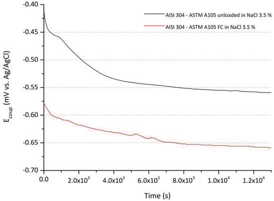 In order to have further insights on the electrochemical behavior of the samples during fatigue testing conditions, galvanic coupling tests were performed on the unloaded (reference) sample as well as on the loaded sample during the fatigue corrosion tests. Figure 8 represents the evolution of potential over time of coupled AISI 304—ASTM A105 in a 3.5 wt% NaCl solution for the two conditions.