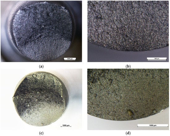 Figure 9 shows the fracture surface of two different AISI304—ASTM A105 specimens tested by fatigue in air. Figure 9a shows the presence of two different areas: The fatigue fracture area at the bottom of the sample, containing the origin where the fatigue cracks started and the unstable fracture area on the top (also called “sudden fracture zone”) [42]. It is possible to observe that the crack probably originated in a different plane with respect to the plane where the crack propagated, and this fact is highlighted by the presence of a shadow in this area. The sudden fracture area, on the contrary, is characterized by a higher roughness, because of the sudden propagation that led to the specimen failure. The same observations are valid for the sample tested at 450 MPa, shown in Figure 9c,d. The samples both failed in the region plasticized during welding at about 1 mm from the interface.