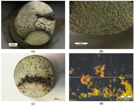 Figure 10 shows the fracture surface of two different AISI304—ASTM A105 specimen tested to FC in a 3.5 wt% NaCl solution. The fatigue fracture area is very limited in dimension with respect to one of the samples tested to FA and the transition to the unstable fracture area is very marked. The unstable fracture area is characterized by the presence of circular lines, due to the rotary friction welding process: This fact gives some information about the failure mode of these specimens, as the unstable fracture area is very near to the weld interface. In addition to that, it is also possible to observe that only one main fracture plane was identified in the analyzed samples and the fracture happened at 0.75 mm from the weld interface. The behavior of the specimens and their lower fatigue cycle number resistance is probably related to the aggressive environment that weakened the specimen causing a localized corrosion attack, as it is possible to see in Figure 10d. In addition to that, it is also possible to observe that only one main fracture plane was identified in the analyzed samples.
