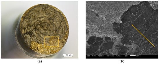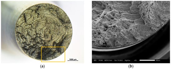 (a) Optical image of the fracture surface of a welded AISI304—ASTM A105 specimen tested to accelerated fatigue corrosion (FC-A); (b) SEM micrograph of the area in between the fatigue fracture surface and the unstable fracture surface.
