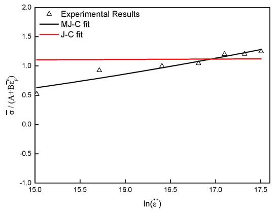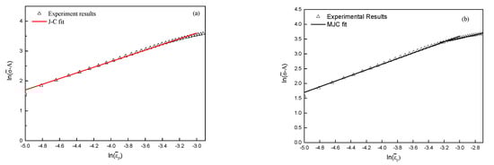 Different from the J–C model, the improved J–C model uses piecewise function to describe the strain effect. Figure 4a,b presents the fit line of the relationship between and by the basic J–C model and the modified J–C model. It is obvious that the fitted line using the piecewise function was closer to the experimental results. The strain hardening effect in the modified J–C constitutive model can be expressed in Equation (5).