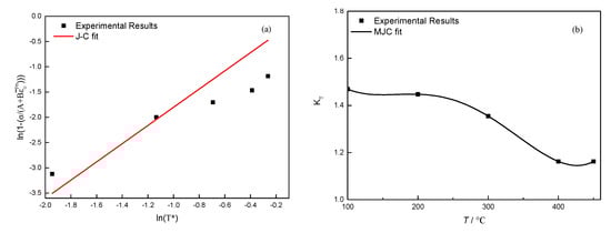 Similarly, according to the SHPB experiment at different temperatures at the reference strain rate condition, Equation (9) can be obtained by simplifying the original equation’s strain rate value to 1 and applying the natural logarithm of both sides of the Equation. m can be calculated to be 1.80151. The fit line is shown in Figure 6a.