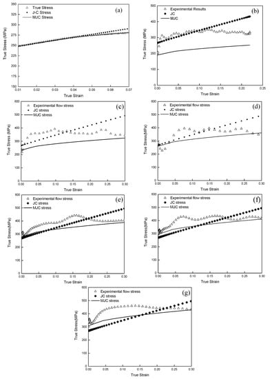 Comparison between experimental and predicted stresses at (a) reference strain rate; (b) 2000 s‒1; (c) 4000 s‒1; (d) 6000 s‒1; (e) 8000 s‒1; (f) 10,000 s‒1; (g) 12,000 s‒1.