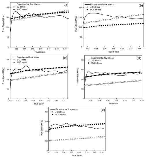 It can be seen from Section 3.1. that the modified J–C constitutive model considered the coupling effects of strain hardening effect, strain rate hardening effect, and thermal softening effect comparing by the basic J–C constitutive model. To analyze the accuracy of two constitutive models, the predicted flow stress, which is calculated by Equations (11) and (12), was compared with the experimental results.