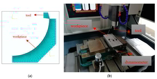 Considering the characteristics of milling, a two-dimensional cycloidal cutting simulation model was built based on the two J–C constitutive equations and the J–C model [28]. The milling experiments were performed with a four-edge carbide tool with diameters of 6 mm to validate the simulation results. In this study, numerical control engraving and milling machine SXDK6050D was used, with a spindle speed that could reach up to 100,000 r/min. A Kister dynamometer was used to measure the cutting forces in three directions during the milling process. The workpiece size was 200 × 100 × 10 mm3. The established two-dimensional finite element model and milling experimental setup are shown in Figure 9a,b. Table 2 presents the machining parameters of milling experiments.