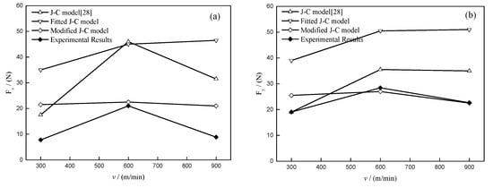 Figure 10a,b illustrates the comparison between the feed force (Fx) and tangential force (Fy) simulated by different J–C constitutive models and the cutting force measured by experiments. It can be seen that the cutting force predicted by the improved J–C constitutive equation was closer to the cutting force measured experimentally compared with the other two J–C constitutive equations. In addition, Figure 10b illustrates that the cutting force simulated by the improved J–C constitutive model showed the same trend as that measured by the experiment. The cutting force first rose and then decreased with the cutting speed increasing, reaching a maximum at 600 m/min.