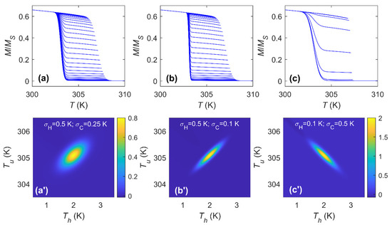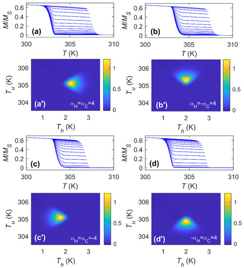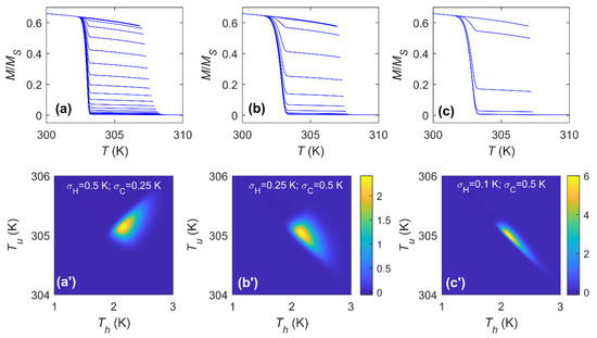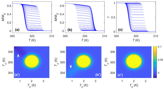 Next, we checked the cases for which both heating and cooling processes remain symmetric () but with different transition ranges (). Figure 5a’–c’ shows the cooling TFORC distribution for different (for simplification, the transition temperatures are and for all the cases). It can be observed that as the difference between and appears, the circular behavior (shown in Figure 3a’) changes to a rotated ellipse for which its major symmetry axis is located along the +45° line with respect the maximum if . As the difference between and increases, the ellipse becomes narrower. When , the major symmetry axis of the ellipse is rotated 90°. This observation highlights that not only the shape of the distribution is important but the orientation also gives us useful information. It can be noted that, although the shape is not circular, the ellipse keeps its center at and .
