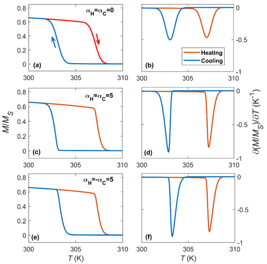 Then by knowing the magnetization curves of both FM and PM phases, and , respectively, which are obtained from the Bean–Rodbell model (shown in Figure 1), the magnetization for the heating and cooling processes are expressed as: