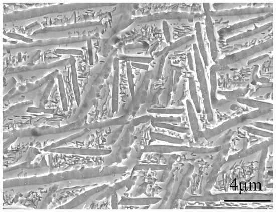 The Ti-17 alloy bar, provided by Guizhou Anda Aviation Forging Co., Ltd., P.R. China, has a nominal composition of Ti-5Al-2Sn-2Zr-4Mo-4Cr. The β transus temperature of the alloy was determined by dilatometric method using a DIL-805 A/D dilatometer (Bähr, Germany) at approximately 1173 ± 5 K. The microstructure of the as-received material was a typical basket-weave characteristic and consisted of coarse α platelets and fine needle-like α phase distributed on the β matrix, as shown in Figure 1.