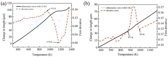 Dilatometric curves and corresponding derivative curves of Ti-17 alloy during heating (a) and cooling (b).
