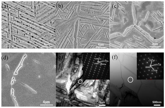 Figure 3 shows the microstructure of the Ti-17 alloy heated to 998, 1058, 1118, and 1178 K at a heating rate of 0.2 K/s and then rapidly cooled to room temperature at a cooling rate of 80 K/s. A number of α platelets uniformly existed in the matrix of the alloy heated up to 998 K, and the fine needle-like α phase in the matrix transformed into β phase. The volume fraction of the remaining α platelets with mean thickness of approximately 0.8 μm was 42.8%, as shown in Figure 3a. With the increase in temperature, the thicker plate-like α phases started to dissolve into the matrix and the volume fraction of α phase further decreased in the matrix. However, a small amount of α platelets that accumulated at prior β grain boundaries of the alloy coarsened when heated up to the higher temperature. These phenomena can be attributed to the volume fraction of α phase in the alloy decreasing on the basis of the level law and the diffusion coefficients of atoms increasing with the increase in temperature. Furthermore, the atoms preferentially segregated along the grain boundaries because of their higher energy state, resulting in αGB (α phase on grain boundaries) coarsening, as shown in Figure 3b,c. When the alloy was heated up to 1178 K and then rapidly cooled to room temperature at a cooling rate of 80 K/s, the microstructure almost consisted of a large amount of β phase and only 3.4% α phase, as shown in Figure 3d. The above-mentioned microstructural evolution produced in the temperature range corresponding the shrinking of the dilatometric curve of the alloy during heating. Two representative bright-field TEM images of the alloy heated to 933 and 1178 K, along with selected area diffraction patterns, are shown in Figure 3e and f, respectively. In addition to the observed plate-like α phase distributed on the matrix, a large number of dislocations also piled up in the near area α/β interfaces in the alloy, as shown in Figure 3e. The dislocations disappeared when the heating temperature was increased due to recovery.