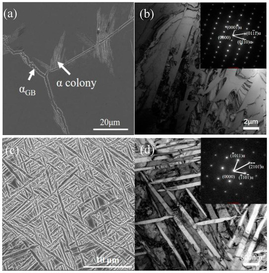 Microstructure of Ti-17 alloy cooled to 1003 K and 893 K at a cooling rate of 0.1 K/s: (a) SEM micrograph of Ti-17 alloy cooled to 1003 K; (b) microstructure of the α colony tip in the (a) and corresponding diffraction pattern; (c) SEM micrograph of Ti-17 alloy cooled to 893 K; (d) microstructure of the alloy cooled to 893 K and corresponding diffraction pattern.