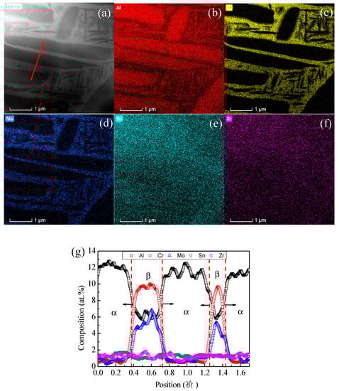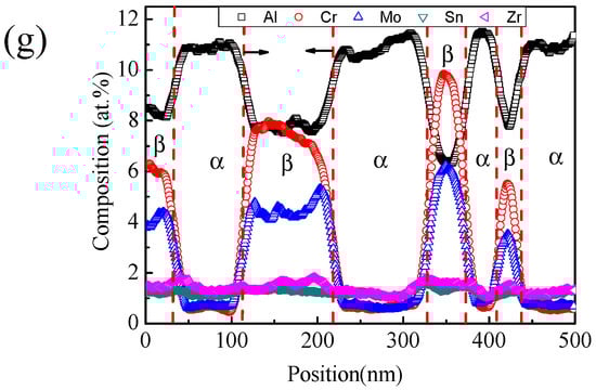 Figure 8 shows the local compositions in the α and β phases of the Ti-17 alloy cooled to 893 K at 0.1 K/s and then rapidly cooled to room temperature at 80 K/s. Compared with 1003 K, the volume fraction of the α phase further increased and the α phase distributed regularly on the matrix. It is found that the distribution characteristic of alloying element in the α and β phases was more obvious. The α/β interface continued to move from the α to β phase in the matrix. These phenomena were attributed to the redistribution of α-stabilizer and β-stabilizer during slow cooling. Moreover, the contents of Al in the α phase and Cr and Mo in the β phase further increased in Figure 8g, which is basically closed to the concentration in equilibrium.