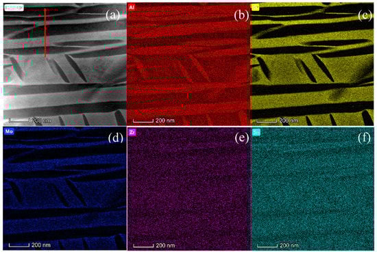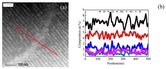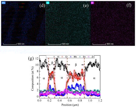 Microstructure and local composition mapping in the sample heated to 933 K: (a) HAADF (high-angle annular dark field image), (b) Al, (c) Cr, (d) Mo, (e) Sn, (f) Zr, and (g) composition profiles along the red line in (a).