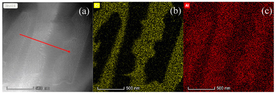 Figure 6a shows TEM bright-field images the frozen microstructure and local compositions of the Ti-17 alloy after heating at a heating rate of 0.2 K/s up to 1178 K and then rapidly cooled to room temperature at a cooling rate of 80 K/s. It can be seen that a pattern of parallel domains existed in the β matrix of the alloy. A nominal period of 27 nm was obtained by considering the distance between the peak intensities of the domains. As mentioned previously, when the alloy was heated to 1178 K, the microstructure of the alloy primary consisted of the β phase. Thus, it could be considered that the periodic domains were transformed from the β phase during rapidly cooling for the alloy, which are associated with the composition modulations of spinodal decomposition of the β phase [25]. Similar microstructures stemming from the spinodal decomposition mechanism for β phase were obtained upon quenching Cu-Ti alloys [26,27]. Figure 6b showed domains of different compositions, namely β’ and β that are poor and rich in β stabilizers, respectively. Moreover, the interface between two phases is not sharp but very diffuse, there is still an effective interfacial energy contribution. The magnitude of this energy depends on the composition gradient across the interface, and for this reason it is known as a gradient energy [28].