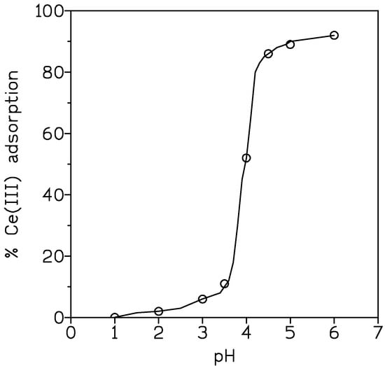 Results are shown in Figure 2, in which a decrease in cerium adsorption occurred as the pH of the solution decreased. The results can be explained according to what is shown in Equation (8); that is, a shift of the equilibrium to the left as the proton concentration in the solution increased.