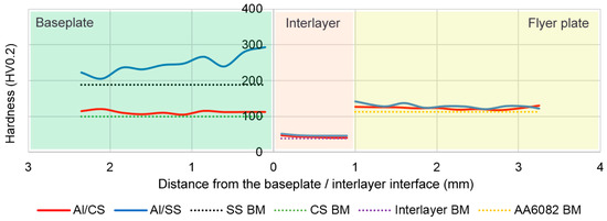 Figure 4 presents the Vickers microhardness profiles of both weld series. It shows an increase in hardness compared to the base materials hardness. This is typical from the explosive welding process and is a consequence of the strong plastic deformation promoted by the impact. Both weld series presented a general increase in hardness throughout the thickness and a slightly more pronounced increase near the interface. The AISI 304 stainless steel presented the highest increase since work hardening is an effective hardening mechanism for this type of steel.