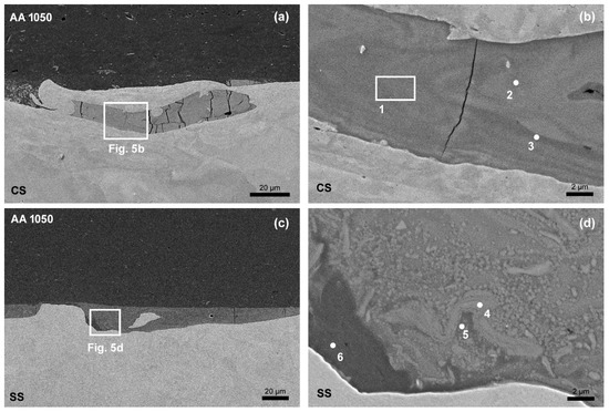 SEM micrographs of the dissimilar interface of the welds: (a,b) Al/CS weld series; (c,d) Al/SS weld series.