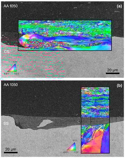 EBSD micrographs registered at the dissimilar interface of the welds: (a) Al/CS welds; (b) Al/SS welds.